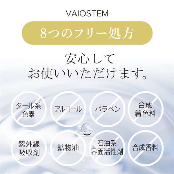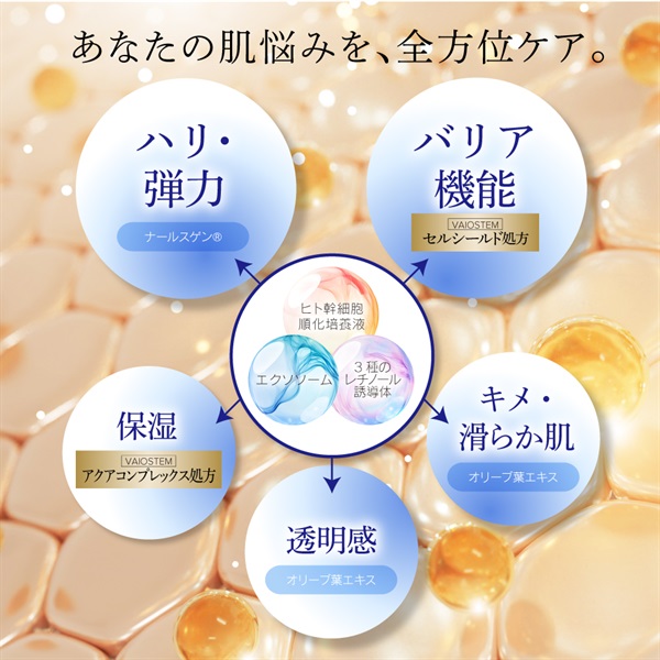 水、グリセリン、ヒト幹細胞順化培養液、BG、1,2-ヘキサンジオール、ヒト脂肪由来間葉系細胞エクソソーム、グリコシルトレハロース、サッカロミセス/ダイズタンパク発酵物、ココアンホジ酢酸2Na、水添レシチン、スイゼンジノリ多糖体、セラミドNG、ナットウガム、ダマスクバラ花油、ポリクオタニウム-51、ポリグルタミン酸、オリーブ葉エキス、カルボキシメチルフェニルアミノカルボキシプロピルホスホン酸メチル、ジメチルイソソルバイド、レチノイン酸ヒドロキシピナコロン、リノール酸レチノール、パルミチン酸レチノール、コーン油、ホホバ種子油、イソステアリン酸、ジラウロイルグルタミン酸リシンNa、ポリアクリル酸Na、ミリスチン酸ポリグリセリル-10、加水分解水添デンプン、カルボマー、シクロヘキサシロキサン、クエン酸Na、クエン酸、塩化Na、キサンタンガム、メチルグルセス-10、シクロペンタシロキサン、トコフェロール、ペンチレングリコール、エチルヘキシルグリセリン、フェノキシエタノール