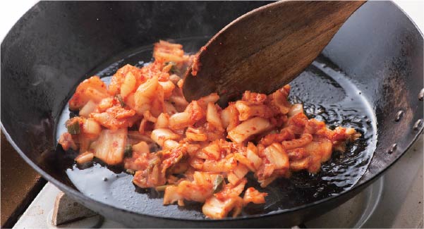 - ②①のフライパンにキムチを加えて水分を飛ばすように炒める。