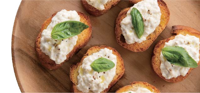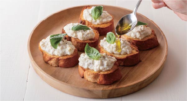 - ③バケットに②・バジルをのせてオリーブオイルをかけ、粗びきこしょうをふる。