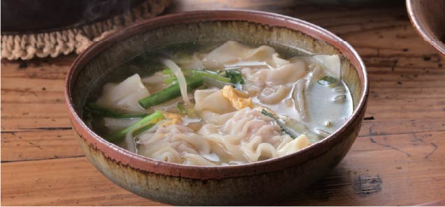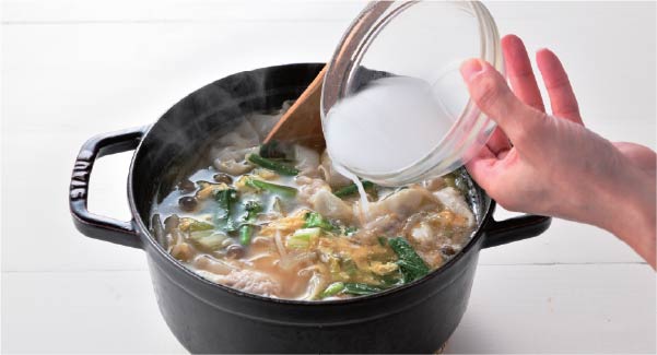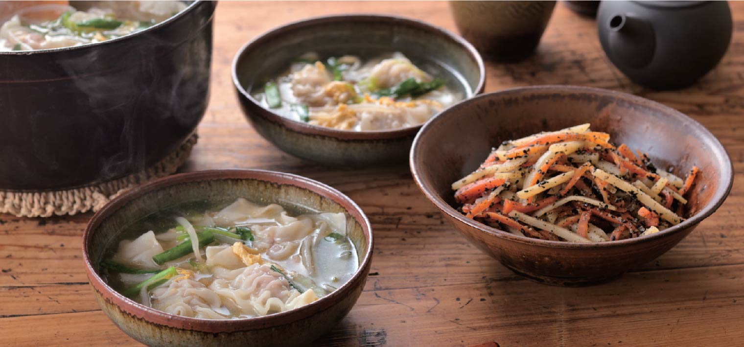 - ③②に①のワンタンを入れ、ワンタンが透き通ってきたら溶き卵を加えてから塩・こしょう(分量外)で味を調え、水溶き片栗粉でとろみをつける。