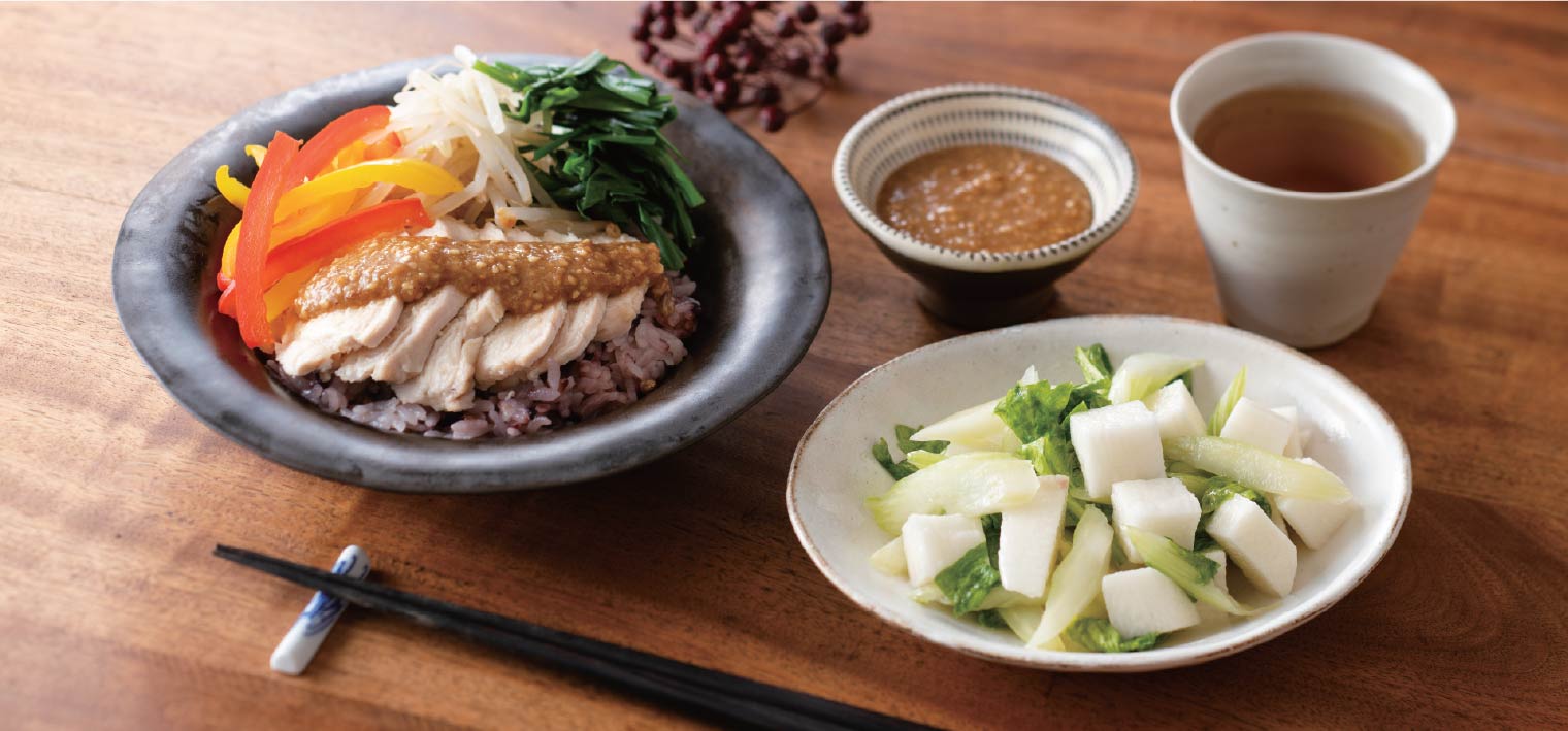 - ③皿に雑穀ごはん・②の野菜・そぎ切りにした鶏ムネ肉を盛りAをかける。