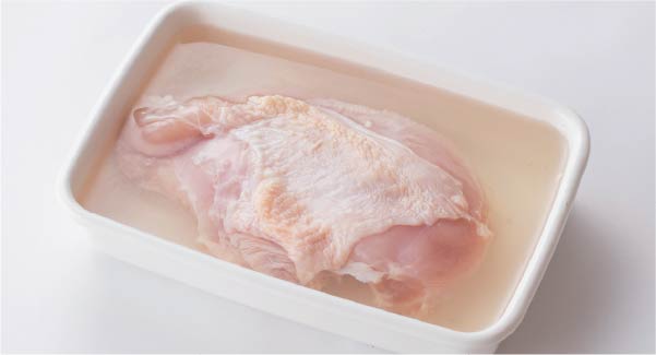 - ①鶏ムネ肉は小さめのバットに入れ、水・砂糖・塩を加えて2時間~半日浸す。(ビニール袋でもOK。)