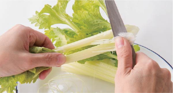- ①セロリは筋を取り斜め3mm幅の薄切りにして葉はザク切りに。