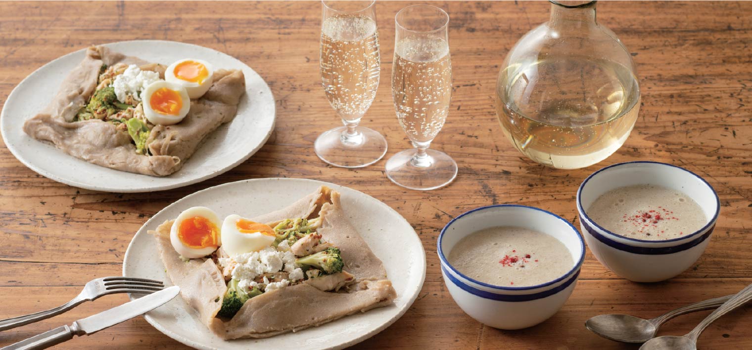 鶏ささみ肉をハム仕立てにして焼き、ゆでたブロッコリー・半熟卵をそば粉のクレープで頂きます。マスタードベースのソースと低カロリーのさっぱりとしたカッテージチーズで素材の味と調和する一品。食物繊維たっぷりのきのこと豆乳ポタージュでお肌も喜ぶカフェ風レシピです。